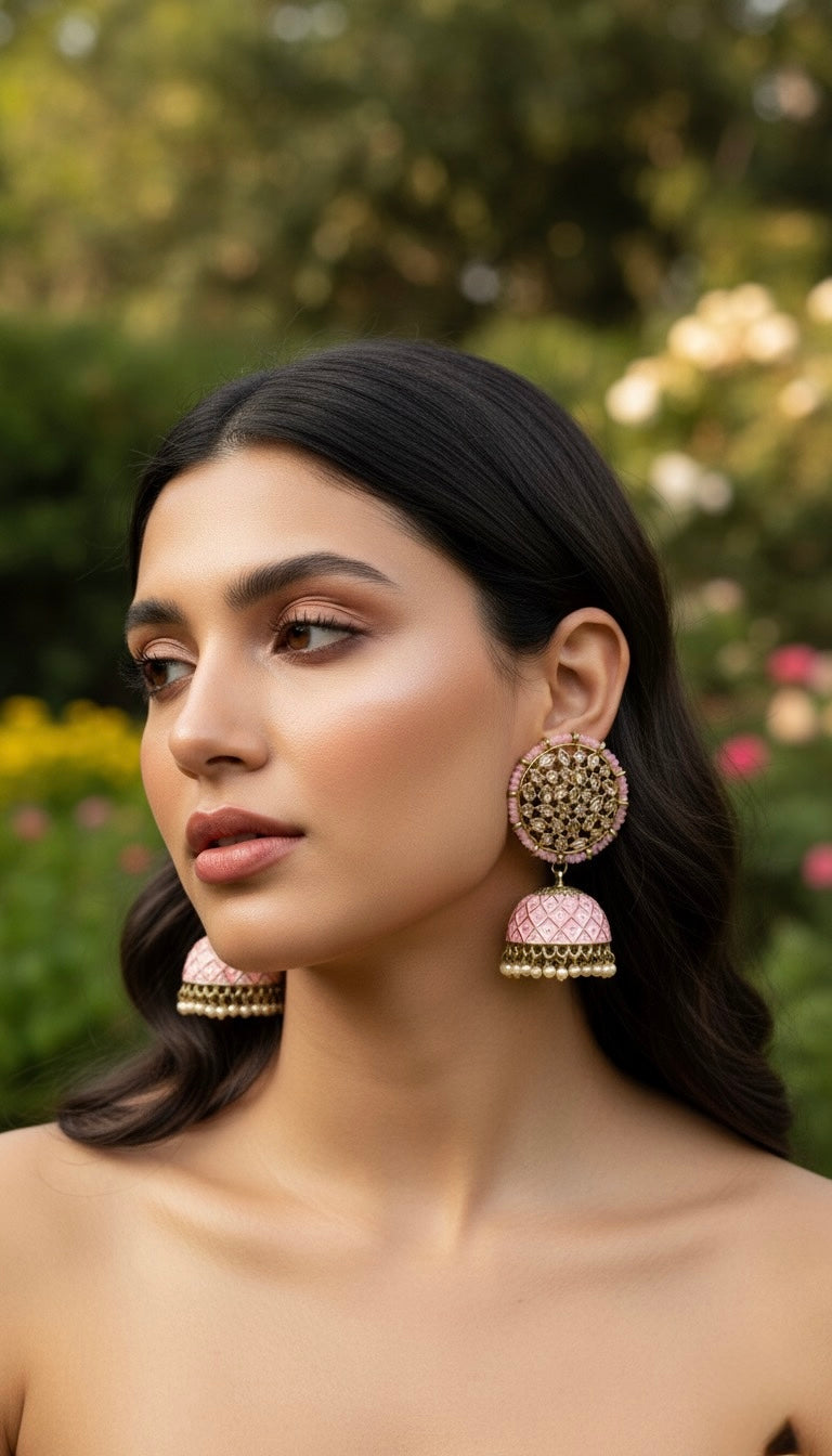 Polki Kundan Handpainted Meenakari Jhumka Earrings with Pearls | Traditional Ethnic Jewelry
